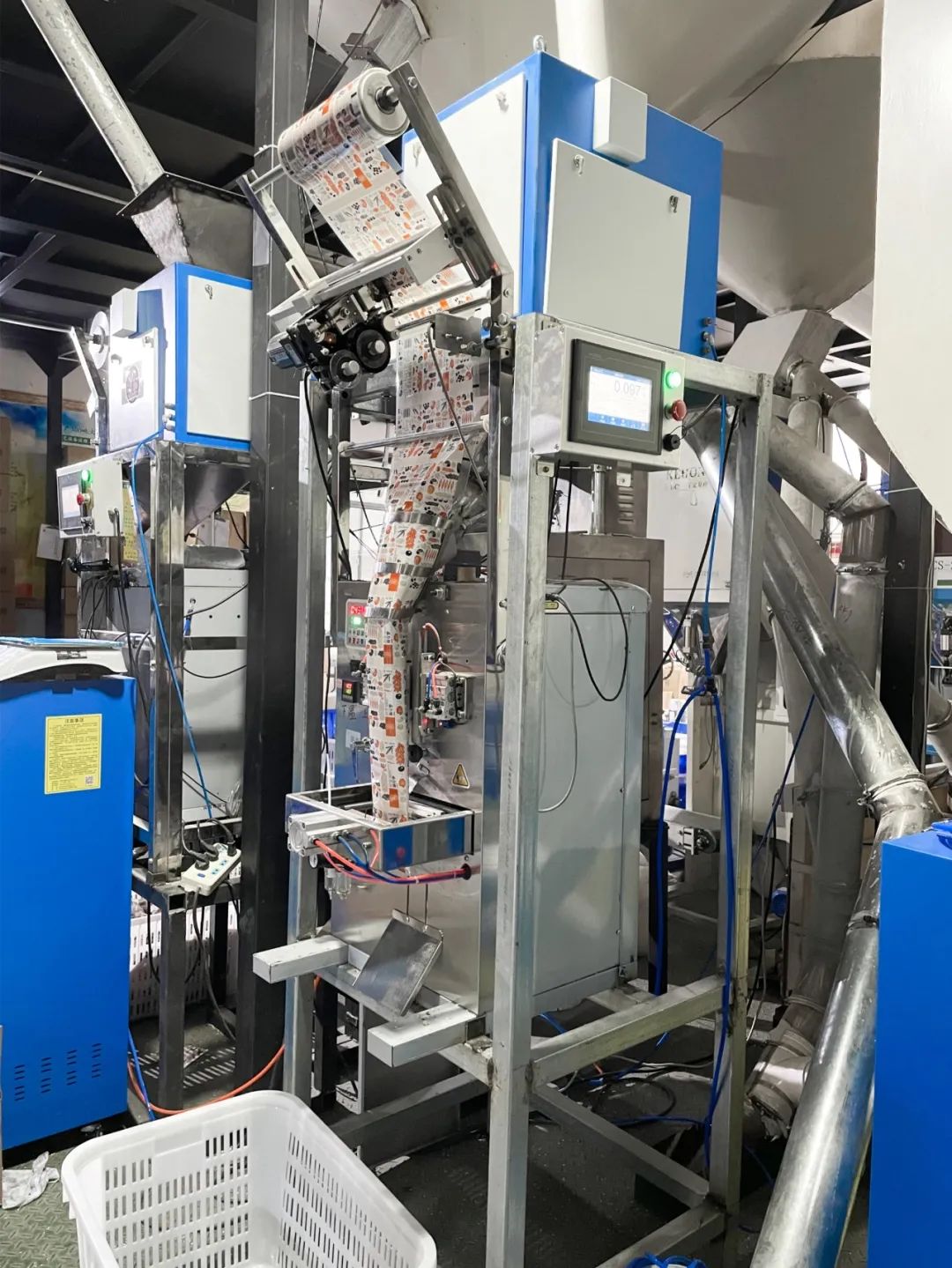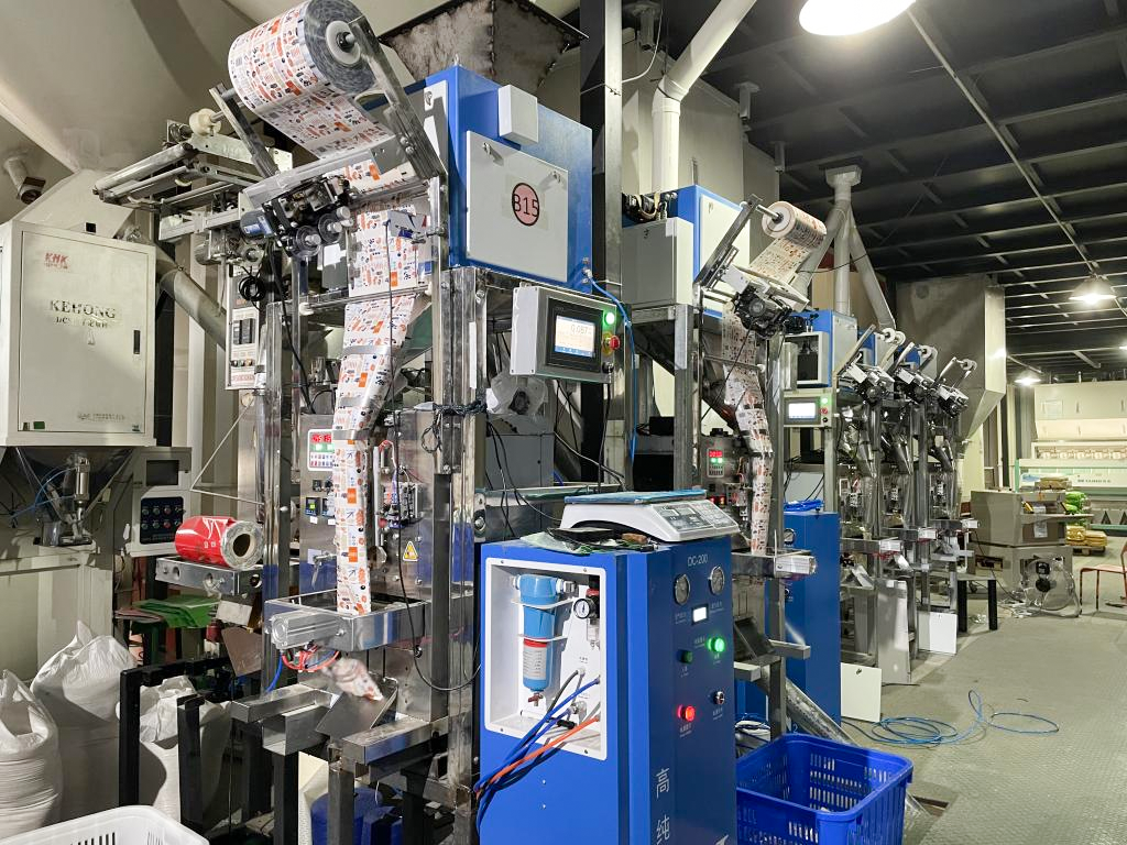 據了解,一臺5kg量程的立式包裝機一小時能包800袋以上的100克/包的雜糧,全稱振盤給料,精度控制在95%。現場5臺立式包裝機,日產量超5萬包。