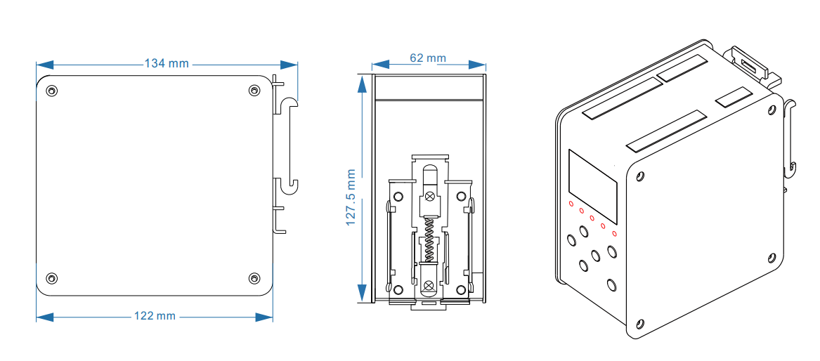 ● DIN卡軌式安裝,不銹鋼外殼,尺寸小巧(62X134X128mm),工業感強;